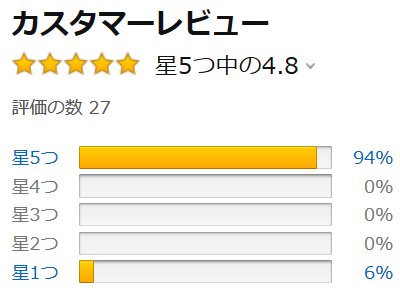 下の事例2では、星5つをつけている人が全体の94%と非常に高いです。ただ、全体のレビュー数は27件とそれほど多くはなく、本当に良い製品なのかもしれません。それでも結構怪しいなというのが正直な感想です。ちなみに、この商品を販売しているメーカーは聞いたことがありませんでした。