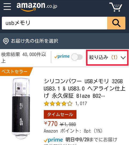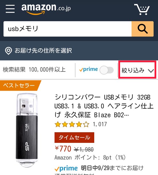 たとえば、USBメモリを検索した場合を見てみます。画面右上の絞り込みをタップします。