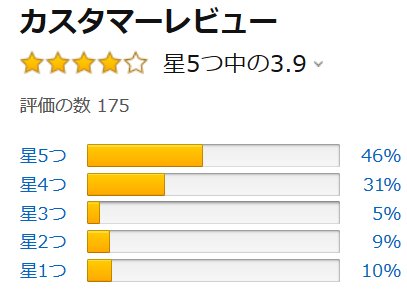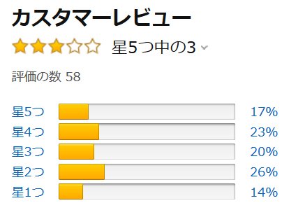 一般的にレビューの数が集まるほど、評価は割れるのが普通です。たとえば、以下のように全体的に均等に評価が集まるということが起こります。また、良い商品の場合には、星5つや星4つに7割程度の評価が集まり、残りは星3つ以下になるというパターンもあります。