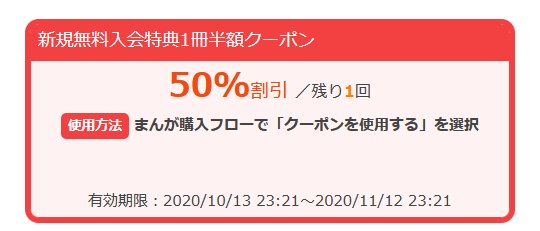 無料会員に登録すると、特典として1冊半額クーポンがもらえます。1回だけしか使えませんが、1冊500円程度する漫画が半額で買えるのはうれしいです。このほかにも、下で紹介するような様々なクーポンを利用することができるので、とてもお得にマンガを読むことができます。
