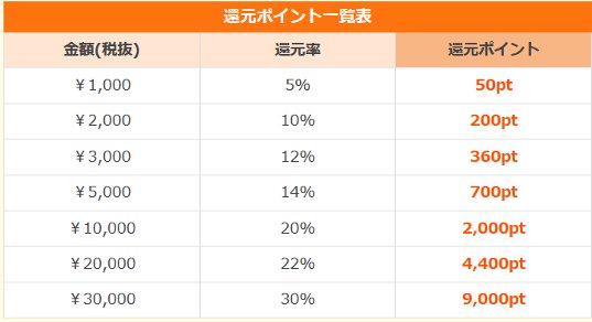 還元率は下の表のようになっていて、一定期間内に使用したポイント(累計ポイント)が2,000ポイントの場合は100ポイントが還元され、10,000ポイントの場合は1,250ポイントが還元されることになります。