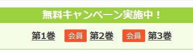 無料で読む場合には、無料会員になっておくと読める範囲が増えます。下の画像のように、3巻程度まで無料の作品については、2巻目以降が会員限定となっていることが多いです。無料で登録できますので、会員になっておくと良いでしょう。