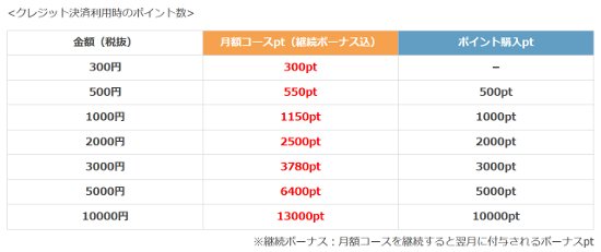 月額コースでは、金額によって継続ボーナスの内容が変わってきます。毎月1,000円の定額コースの場合は150ポイントがもらえますが、5,000円にするとさらに1400ポイントももらえます。金額が多いほどもらえるポイントが増えますが、少しずつでもポイントが余分にもらえるのはうれしいですね。